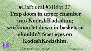 DafYomi, Midot #DafYomi #Midot 37 Date: October 25, 2019Author: ysspitz #DafYomi #Midot 37: Trap doors in upper chamber into KodeshKodashim; workmen let down in baskets so shouldn’t feast eyes on KodeshKodashim. Share this: Share on X (Opens in new window) X Share on Facebook (Opens in new window) Facebook Like Loading... Related