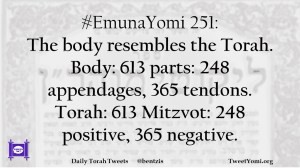 #EmunaYomi 251: The body resembles the Torah. Body: 613 parts: 248 appendages, 365 tendons. Torah: 613 Mitzvot: 248 positive, 365 negative.