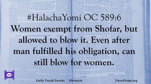 #HalachaYomi OC 589:6 Women exempt from Shofar, but allowed to blow it. Even after man fulfilled his obligation, can still blow for women.