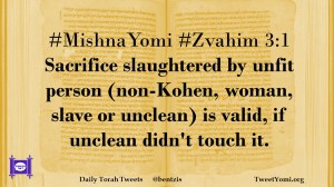 #MishnaYomi #Zvahim 3:1 Sacrifice slaughtered by unfit person (non-Kohen, woman, slave or unclean) is valid, if unclean didn’t touch it.
