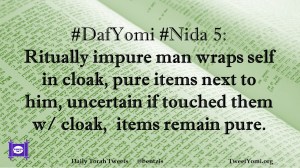 DafYomi, Nida #DafYomi #Nida 5 Date: October 28, 2019Author: ysspitz #DafYomi #Nida 5: Ritually impure man wraps self in cloak, pure items next to him, uncertain if touched them w/ cloak, items remain pure. Share this: Share on X (Opens in new window) X Share on Facebook (Opens in new window) Facebook Like Loading... Related