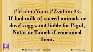 MishnaYomi, Zvahim #MishnaYomi #Zvahim 3:5 Date: October 28, 2019Author: ysspitz #MishnaYomi #Zvahim 3:5 If had milk of sacred animals or dove’s eggs, not liable for Pigul, Notar or Tameh if consumed them. Share this: Share on X (Opens in new window) X Share on Facebook (Opens in new window) Facebook Like Loading... Related