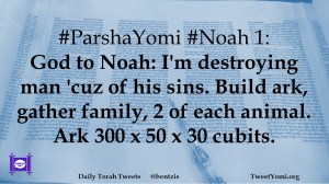 #ParshaYomi #Noah 1: God to Noah: I’m destroying man ‘cuz of his sins. Build ark, gather family, 2 of each animal. Ark 300 x 50 x 30 cubits.