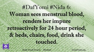 DafYomi, Nida #DafYomi #Nida 6 Date: October 29, 2019Author: ysspitz #DafYomi #Nida 6: Woman sees menstrual blood, renders her impure retroactively for 24 hour period, & beds, chairs, food, drink she touched. Share this: Share on X (Opens in new window) X Share on Facebook (Opens in new window) Facebook Like Loading... Related