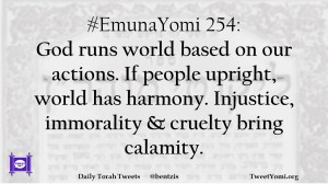 #EmunaYomi 254: God runs world based on our actions. If people upright, world has harmony. Injustice, immorality & cruelty bring calamity.