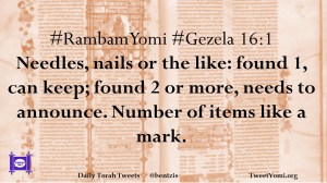 #RambamYomi #Gezela 16:1 Needles, nails or the like: found 1, can keep; found 2 or more, needs to announce. Number of items like a mark.