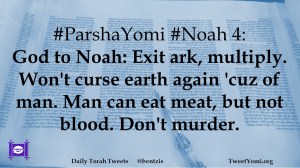 #ParshaYomi #Noah 4: God to Noah: Exit ark, multiply. Won’t curse earth again ‘cuz of man. Man can eat meat, but not blood. Don’t murder