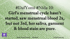 DafYomi, Nida #DafYomi #Nida 10 Date: November 1, 2019Author: ysspitz #DafYomi #Nida 10: Girl’s menstrual cycle hasn’t started, saw menstrual blood 2x, but not 3rd, her saliva, garment & blood stain are pure. Share this: Share on X (Opens in new window) X Share on Facebook (Opens in new window) Facebook Like Loading... Related