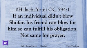 #HalachaYomi OC 594:1 If an individual didn’t blow Shofar, his friend can blow for him so can fulfill his obligation. Not same for prayer.