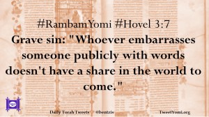 #RambamYomi #Hovel 3:7 Grave sin: “Whoever embarrasses someone publicly with words doesn’t have a share in the world to come.”