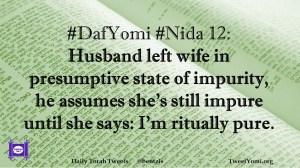 DafYomi, Nida #DafYomi #Nida 12 Date: November 4, 2019Author: ysspitz #DafYomi #Nida 12: Husband left wife in presumptive state of impurity, he assumes she’s still impure until she says: I’m ritually pure. Share this: Share on X (Opens in new window) X Share on Facebook (Opens in new window) Facebook Like Loading... Related