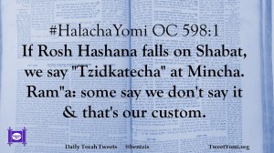 #HalachaYomi OC 598:1 If Rosh Hashana falls on Shabat, we say “Tzidkatecha” at Mincha. Ram”a: some say we don’t say it & that’s our custom.