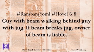 Hovel, RambamYomi #RambamYomi #Hovel 6:8 Date: November 6, 2019Author: ysspitz #RambamYomi #Hovel 6:8 Guy with beam walking behind guy with jug. If beam breaks jug, owner of beam is liable. Share this: Share on X (Opens in new window) X Share on Facebook (Opens in new window) Facebook Like Loading... Related