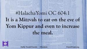 HalachaYomi #HalachaYomi OC 604:1 Date: November 8, 2019Author: ysspitz #HalachaYomi OC 604:1 It is a Mitzvah to eat on the eve of Yom Kippur and even to increase the meal. Share this: Share on X (Opens in new window) X Share on Facebook (Opens in new window) Facebook Like Loading... Related