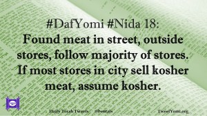 DafYomi, Nida #DafYomi #Nida 18 Date: November 10, 2019Author: ysspitz #DafYomi #Nida 18: Found meat in street, outside stores, follow majority of stores. If most stores in city sell kosher meat, assume kosher. Share this: Share on X (Opens in new window) X Share on Facebook (Opens in new window) Facebook Like Loading... Related