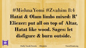 #MishnaYomi #Zvahim 8:4 Hatat & Olam limbs mixed: R’ Eliezer: put all on top of Altar, Hatat like wood. Sages: let disfigure & burn outside.