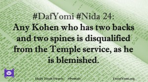 DafYomi, Nida #DafYomi #Nida 24 Date: November 15, 2019Author: ysspitz #DafYomi #Nida 24: Any Kohen who has two backs and two spines is disqualified from the Temple service, as he is blemished. Share this: Share on X (Opens in new window) X Share on Facebook (Opens in new window) Facebook Like Loading... Related