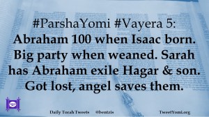 #ParshaYomi #Vayera 5: Abraham 100 when Isaac born. Big party when weaned. Sarah has Abraham exile Hagar & son. Got lost, angel saves them.