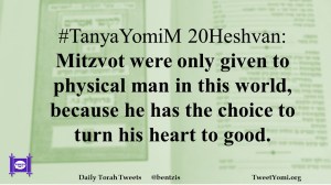 #TanyaYomiM 20Heshvan: Mitzvot were only given to physical man in this world, because he has the choice to turn his heart to good.