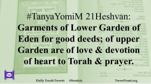 #TanyaYomiM 21Heshvan: Garments of Lower Garden of Eden for good deeds; of upper Garden are of love & devotion of heart to Torah & prayer.
