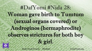 DafYomi, Nida #DafYomi #Nida 28 Date: November 20, 2019Author: ysspitz #DafYomi #Nida 28: Woman gave birth to Tumtum (sexual organs covered) or Androginos (hermaphrodite) observes strictures for both boy & girl. Share this: Share on X (Opens in new window) X Share on Facebook (Opens in new window) Facebook Like Loading... Related
