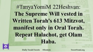 #TanyaYomiM 22Heshvan: The Supreme Will vested in Written Torah’s 613 Mitzvot, manifest only in Oral Torah. Repeat Halachot, get Olam Haba.