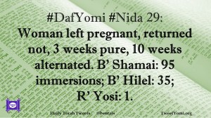 DafYomi, Nida #DafYomi #Nida 29 Date: November 21, 2019Author: ysspitz #DafYomi #Nida 29: Woman left pregnant, returned not, 3 weeks pure, 10 weeks alternated. B’ Shamai: 95 immersions; B’ Hilel: 35; R’ Yosi: 1. Share this: Share on X (Opens in new window) X Share on Facebook (Opens in new window) Facebook Like Loading... Related