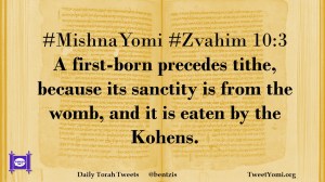 MishnaYomi, Zvahim #MishnaYomi #Zvahim 10:3 Date: November 21, 2019Author: ysspitz #MishnaYomi #Zvahim 10:3 A first-born precedes tithe, because its sanctity is from the womb, and it is eaten by the Kohens. Share this: Share on X (Opens in new window) X Share on Facebook (Opens in new window) Facebook Like Loading... Related