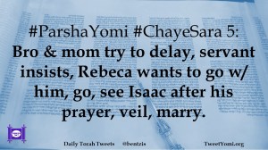 #ParshaYomi #ChayeSara 5: Bro & mom try to delay, servant insists, Rebeca wants to go w/ him, go, see Isaac after his prayer, veil, marry.