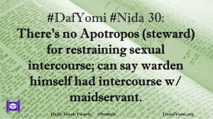 DafYomi, Nida #DafYomi #Nida 30 Date: November 22, 2019Author: ysspitz #DafYomi #Nida 30: There’s no Apotropos (steward) for restraining sexual intercourse; can say warden himself had intercourse w/ maidservant. Share this: Share on X (Opens in new window) X Share on Facebook (Opens in new window) Facebook Like Loading... Related