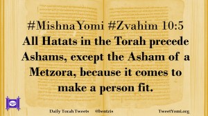 #MishnaYomi #Zvahim 10:5 All Hatats in the Torah precede Ashams, except the Asham of a Metzora, because it comes to make a person fit.