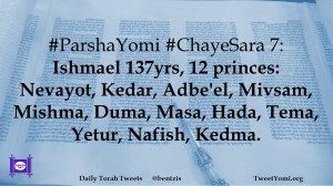 #ParshaYomi #ChayeSara 7: Ishmael 137yrs, 12 princes: Nevayot, Kedar, Adbe’el, Mivsam, Mishma, Duma, Masa, Hada, Tema, Yetur, Nafish, Kedma.
