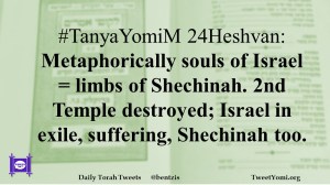 #TanyaYomiM 24Heshvan: Metaphorically souls of Israel = limbs of Shechinah. 2nd Temple destroyed; Israel in exile, suffering, Shechinah too.