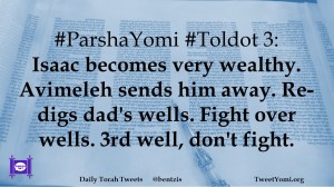 #ParshaYomi #Toldot 3: Isaac becomes very wealthy. Avimeleh sends him away. Re-digs dad’s wells. Fight over wells. 3rd well, don’t fight.