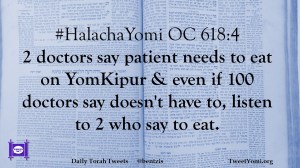 #HalachaYomi OC 618:4 2 doctors say patient needs to eat on YomKipur & even if 100 doctors say doesn’t have to, listen to 2 who say to eat.