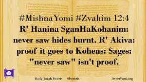 #MishnaYomi #Zvahim 12:4 R’ Hanina SganHaKohanim: never saw hides burnt. R’ Akiva: proof it goes to Kohens: Sages: “never saw” isn’t proof.