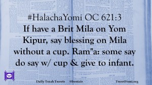 #HalachaYomi OC 621:3 If have a Brit Mila on Yom Kipur, say blessing on Mila without a cup. Ram”a: some say do say w/ cup & give to infant.