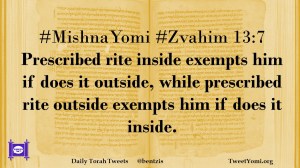#MishnaYomi #Zvahim 13:7 Prescribed rite inside exempts him if does it outside, while prescribed rite outside exempts him if does it inside.