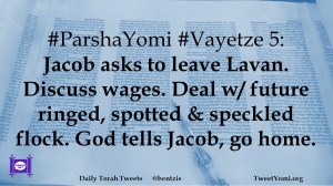 #ParshaYomi #Vayetze 5: Jacob asks to leave Lavan. Discuss wages. Deal w/ future ringed, spotted & speckled flock. God tells Jacob, go home.