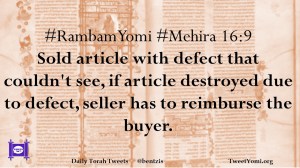 #RambamYomi #Mehira 16:9 Sold article with defect that couldn’t see, if article destroyed due to defect, seller has to reimburse the buyer.