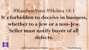 #RambamYomi #Mehira 18:1 It’s forbidden to deceive in business, whether to a Jew or a non-Jew. Seller must notify buyer of all defects.
