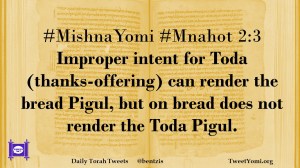 #MishnaYomi #Mnahot 2:3 Improper intent for Toda (thanks-offering) can render the bread Pigul, but on bread does not render the Toda Pigul.