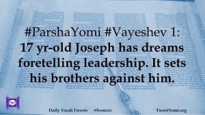 ParshaYomi, Vayeshev #ParshaYomi #Vayeshev 1 Date: December 15, 2019Author: ysspitz #ParshaYomi #Vayeshev 1: 17 yr-old Joseph has dreams foretelling leadership. It sets his brothers against him. Share this: Share on X (Opens in new window) X Share on Facebook (Opens in new window) Facebook Like Loading... Related