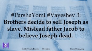 ParshaYomi, Vayeshev #ParshaYomi #Vayeshev 3 Date: December 17, 2019Author: ysspitz #ParshaYomi #Vayeshev 3: Brothers decide to sell Joseph as slave. Mislead father Jacob to believe Joseph dead. Share this: Share on X (Opens in new window) X Share on Facebook (Opens in new window) Facebook Like Loading... Related