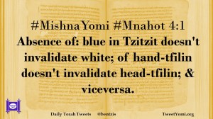 #MishnaYomi #Mnahot 4:1 Absence of: blue in Tzitzit doesn’t invalidate white; of hand-tfilin doesn’t invalidate head-tfilin; & viceversa.