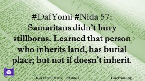 DafYomi, Nida #DafYomi #Nida 57 Date: December 19, 2019Author: ysspitz #DafYomi #Nida 57: Samaritans didn’t bury stillborns. Learned that person who inherits land, has burial place; but not if doesn’t inherit. Share this: Share on X (Opens in new window) X Share on Facebook (Opens in new window) Facebook Like Loading... Related