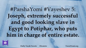 #ParshaYomi #Vayeshev 5: Joseph, extremely successful and good looking slave in Egypt to Potiphar, who puts him in charge of entire estate.