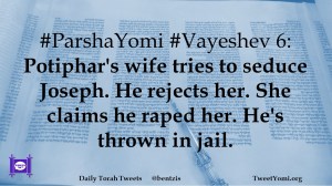 #ParshaYomi #Vayeshev 6: Potiphar’s wife tries to seduce Joseph. He rejects her. She claims he raped her. He’s thrown in jail.
