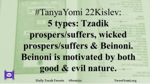 #TanyaYomi 22Kislev: 5 types: Tzadik prospers/suffers, wicked prospers/suffers & Beinoni. Beinoni is motivated by both good & evil nature.