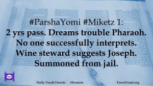 #ParshaYomi #Miketz 1: 2 yrs pass. Dreams trouble Pharaoh. No one successfully interprets. Wine steward suggests Joseph. Summoned from jail.